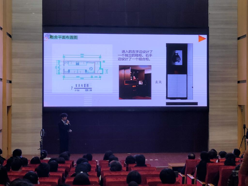 经过前期层层选拔、专业教师和班主任指导,共7组作品参加本次决赛。各小组以主校区雅园宿舍楼、静园宿舍楼的寝室为设计模板,分别采用独具匠心的设计理念、明确的风格定位,通过现场展示,并结合BIMVR多维角度视频,将寝室的规划设计效果给在场观众呈现了细致展示,有别具一格的《创馨园》、有风格大气的《名人堂》、有清新典雅的《静雅轩》。经过激烈角逐,来自建装1901班的作品“同馨小筑”荣获本次大赛第一名。